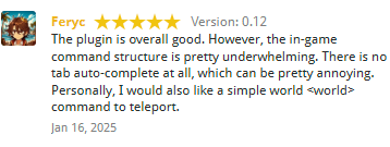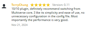 And that's all. This plugin does exactly what you want from a multiverse and world manager plugin—NOTHING MORE. No dozens of useless and unwanted features, and literally 0 EventHandlers.